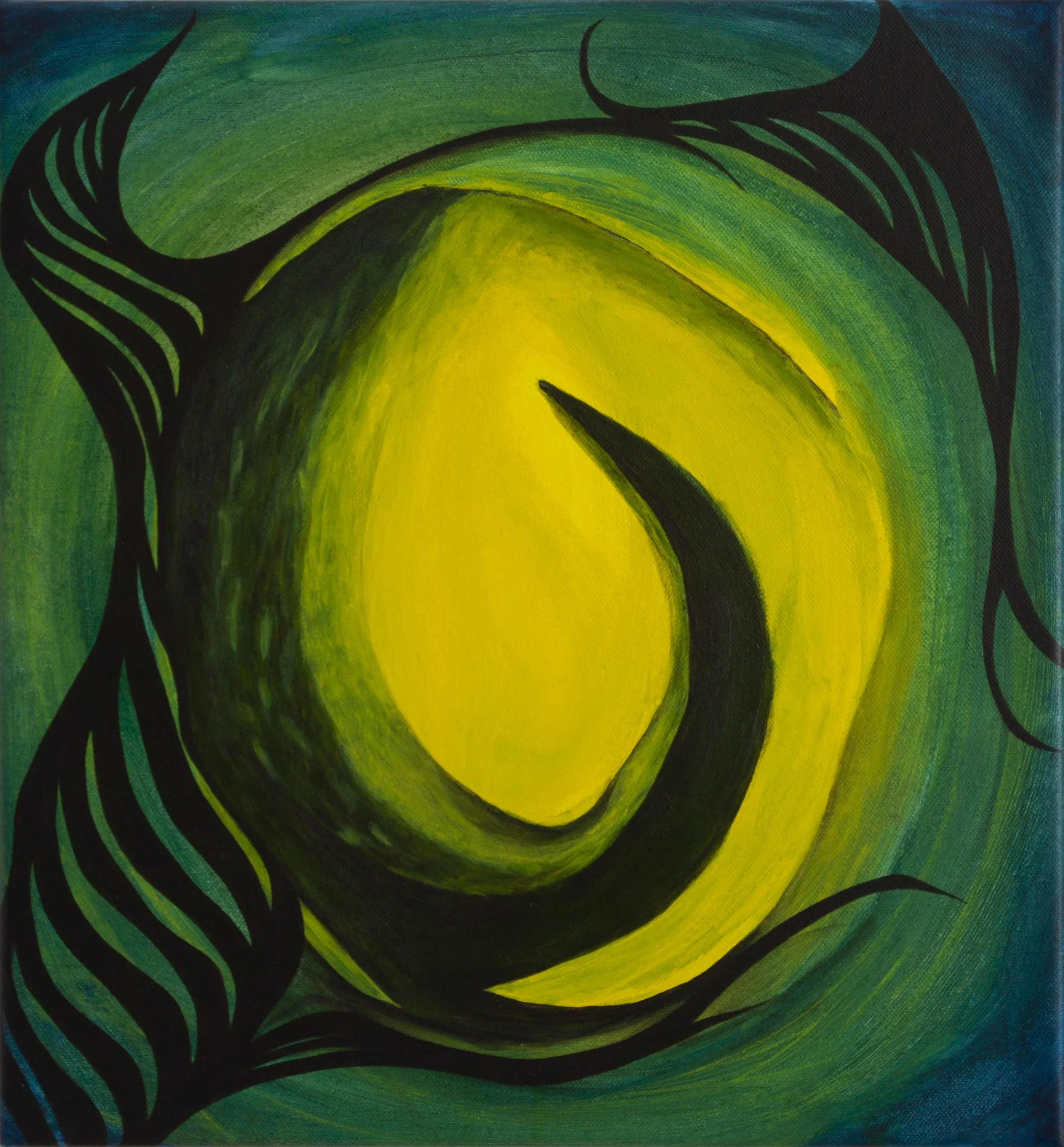 This work began as a color study exploring the harmony between green, yellow, and blue. Later, black acrylic lines were added, giving the composition an atmosphere reminiscent of night and a lunar eclipse.